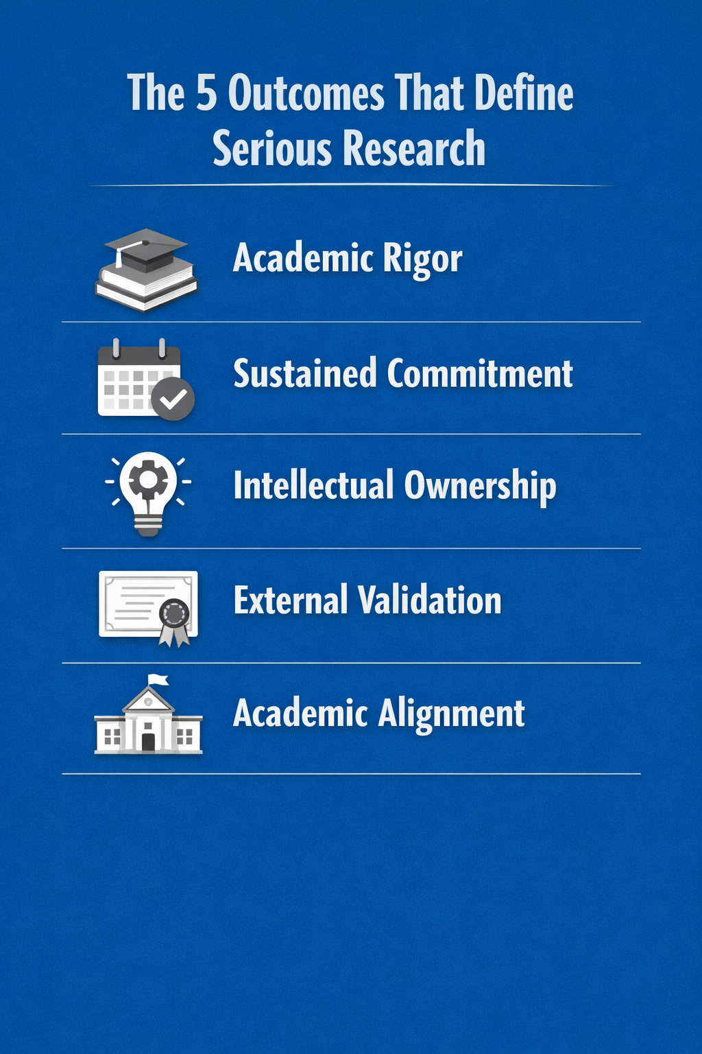 Many independent research projects take months to finish. And if you’re submitting to an external journal, the review process can take even longer. Individual structured guidance helps keep the momentum going and the goal in focus.